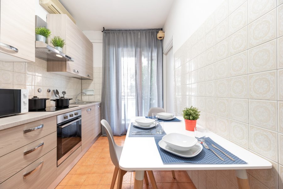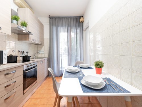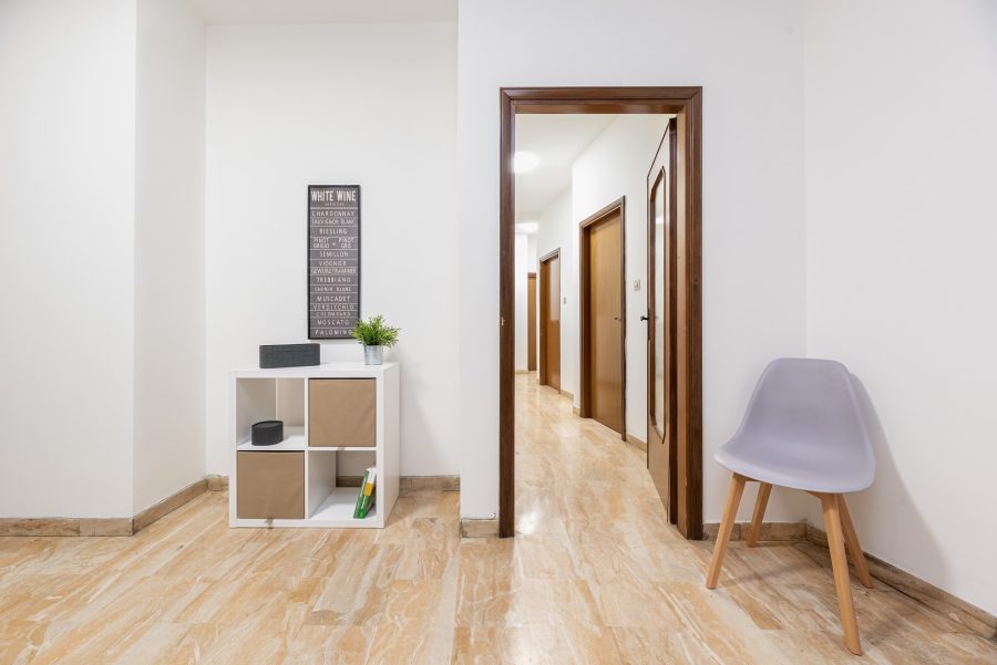 The Apartment was recently renovated and furnished with new furniture in a Modern Minimal Style. It is made up of: a dresser, a Fully Equipped Kitchen with a Terrace, 5 bright Single Rooms, 2 Bathrooms with showers.