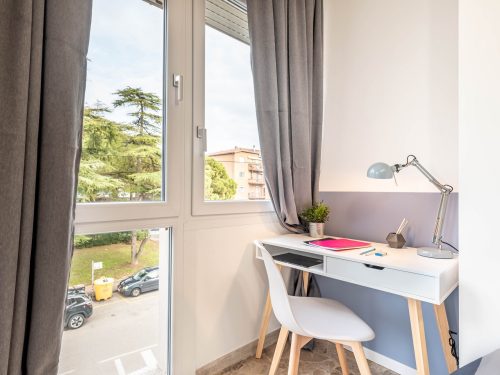 Single room with single bed, slatted frame and mattress, a three-door wardrobe, a desk and study lamp, a chair, two paintings.