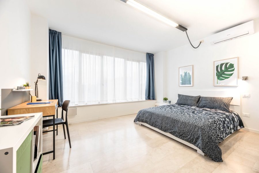 Single room with double bed, slatted frame and mattress, a four-door wardrobe including a mirror, a bookcase with fabric drawers, a desk and study lamp, a chair, a shelf, a bedside table, two paintings, one mirror.