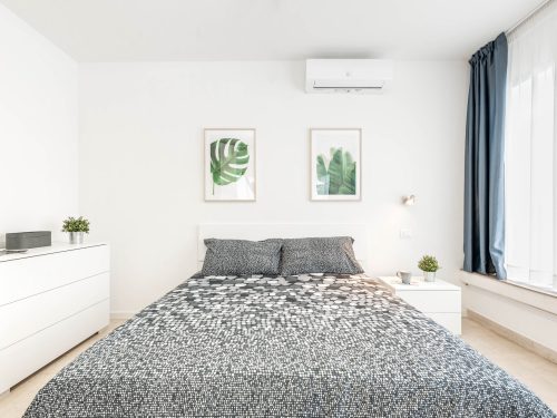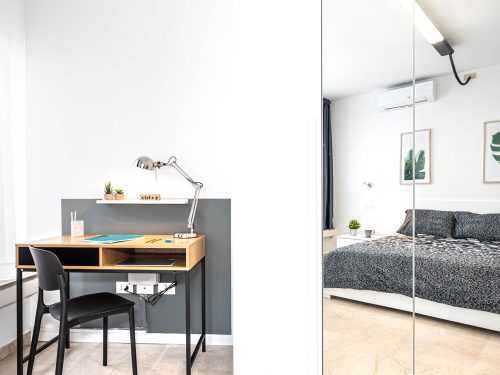 Single room with double bed, slatted frame and mattress, a four-door wardrobe, one of which is mirrored, a desk and study lamp, a chair, a shelf, two paintings, a bedside table, a chest of drawers.