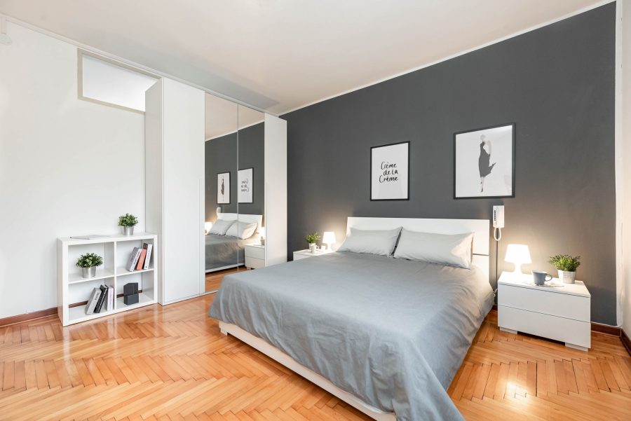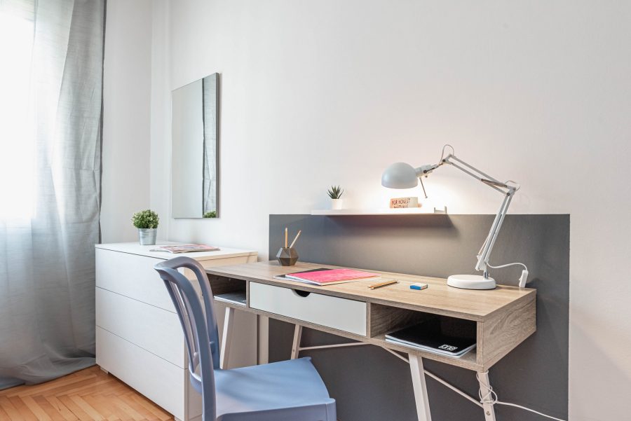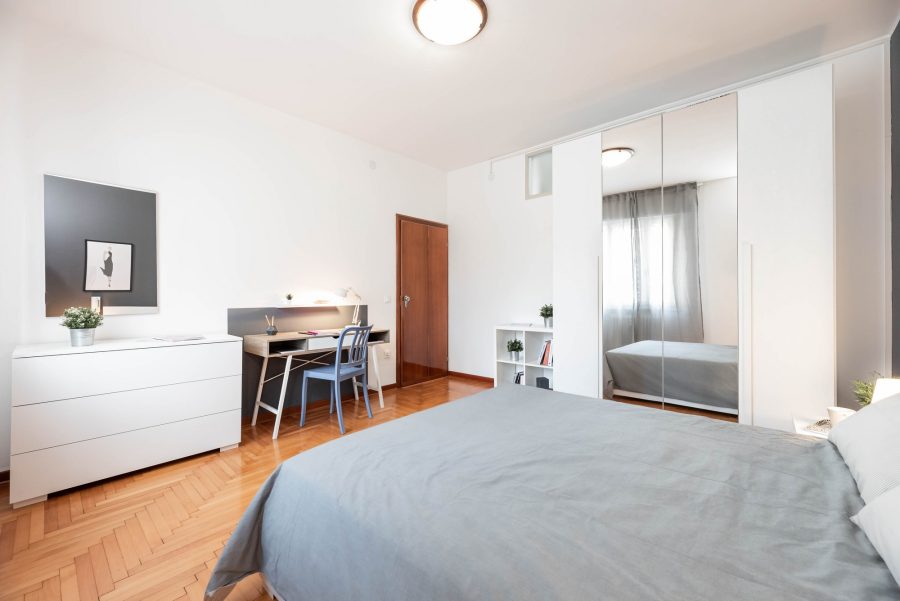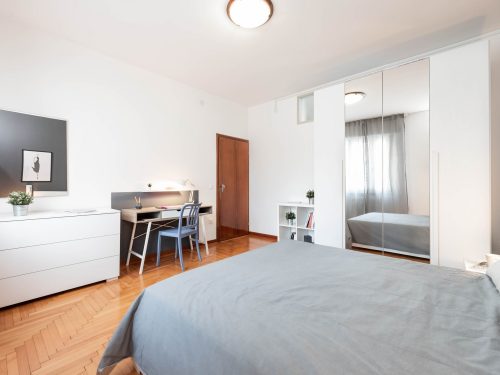 Single room with double bed (double bed, slatted frame and mattress, a four-door wardrobe, a desk and study lamp, a chair, two bedside tables, two paintings, a bookcase, a dresser, a mirror.)
