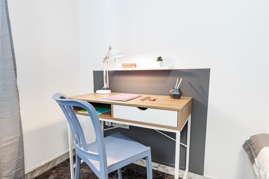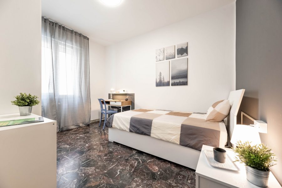 Single room with single bed (single bed, slatted frame and mattress, a three-door wardrobe, a bedside table, a desk and study lamp, a chair, a shelf, three paintings, a bookcase)