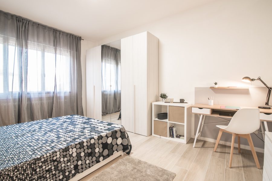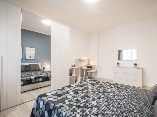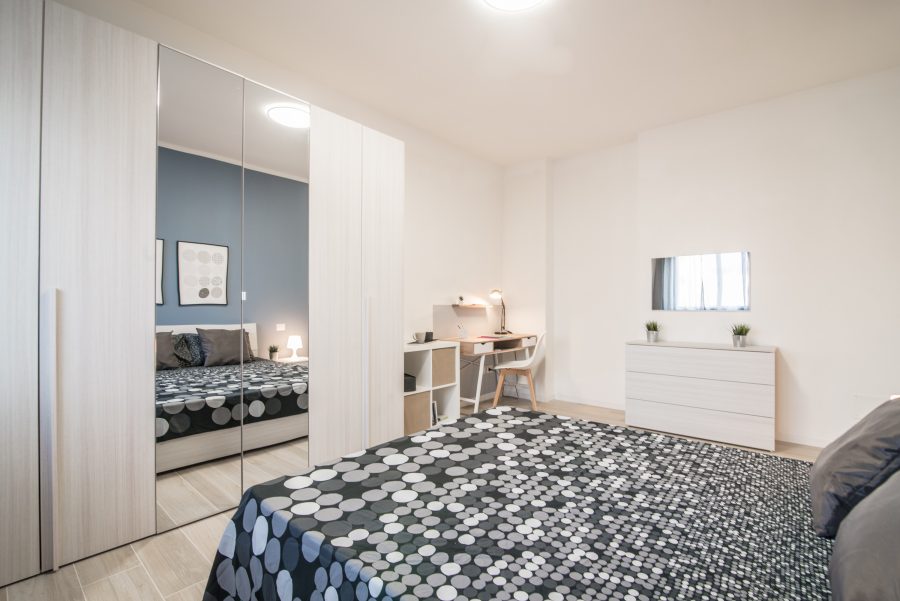 Double room of 15 sqm furnished with: desk with chair, wardrobe with 4 doors, double bed, two bedside tables, wooden slatted base and mattress.