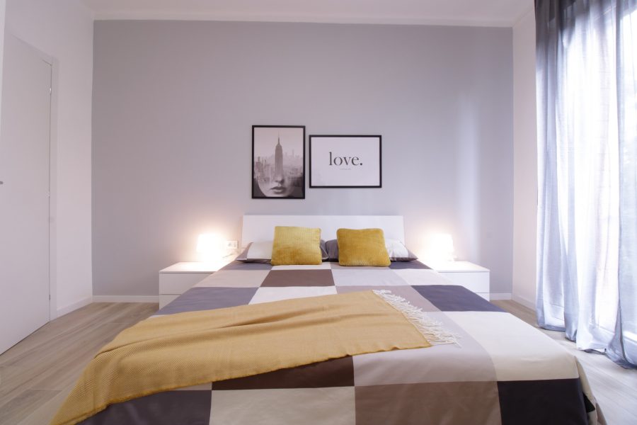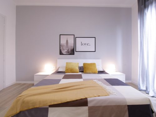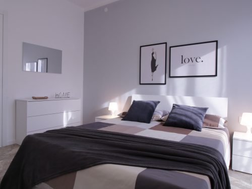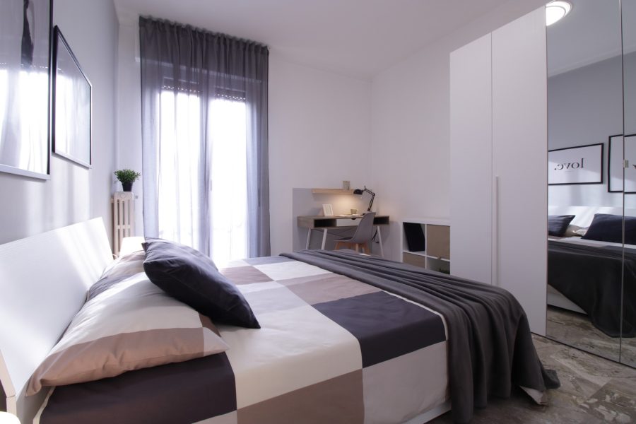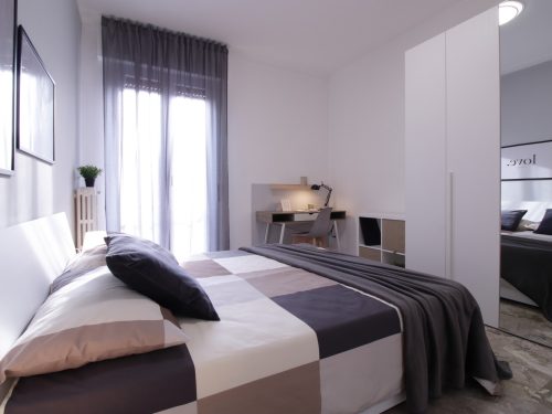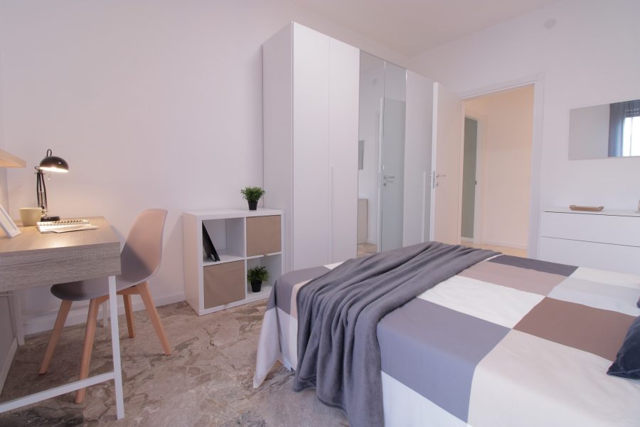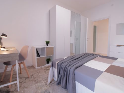 Single room with double bed, slatted structure and mattress, a six-door wardrobe, a bookcase with fabric drawers, a desk and study lamp, a chair, a shelf, two bedside tables, two bedside lamps, a dresser, two paintings, a mirror