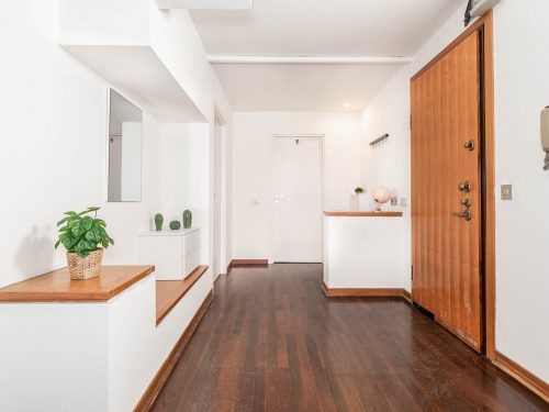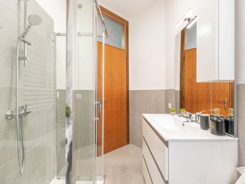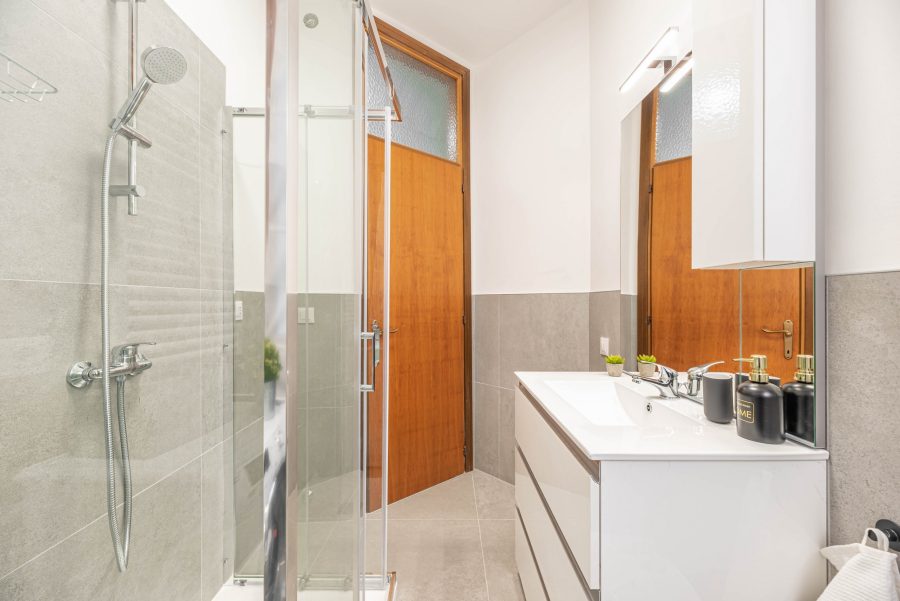 A newly renovated apartment located on the fourth floor, consisting of 5 bright rooms: three with double beds and two with three-quarter beds. It features a spacious, fully renovated kitchen and two modern bathrooms.