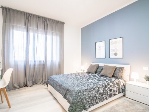 Double room of 15 sqm furnished with: desk with chair, wardrobe with 3 doors, double bed, two bedside tables, wooden slatted base and mattress.