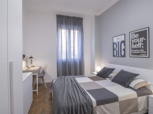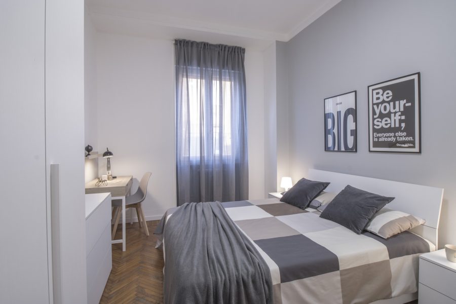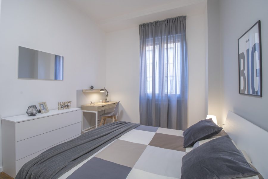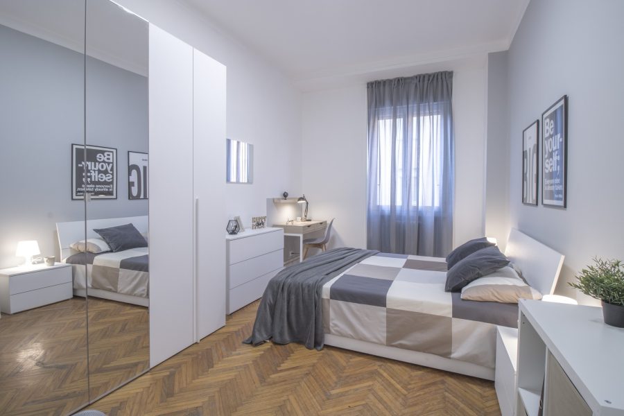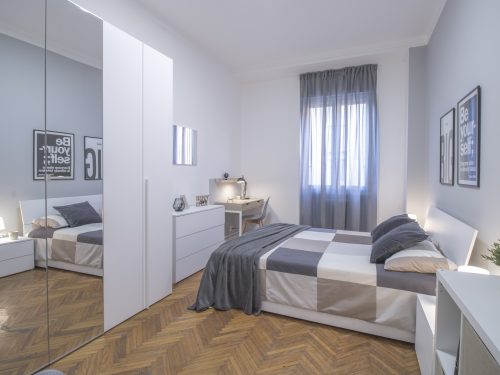 Single room with double bed, slatted structure and mattress, a six-door wardrobe, a bookcase with fabric drawers, a desk and study lamp, a chair, a shelf, two bedside tables, two night lamps, a dresser, an armchair, two paintings, a mirror.