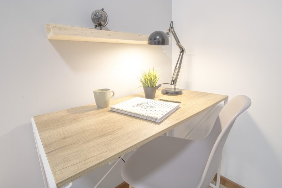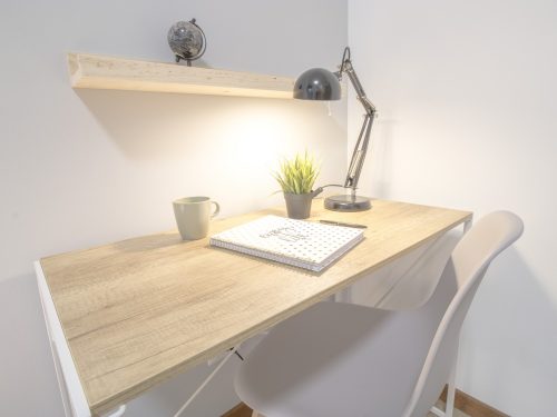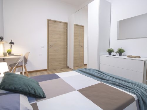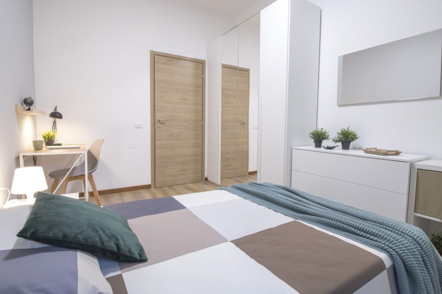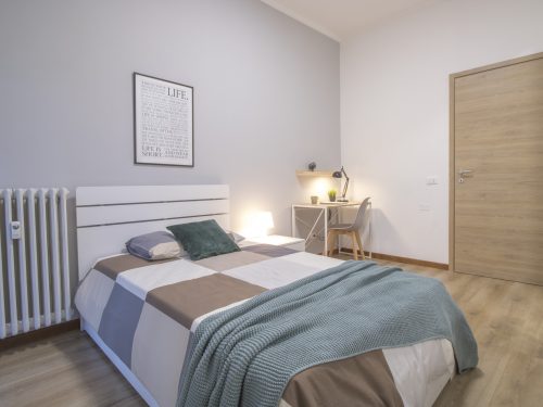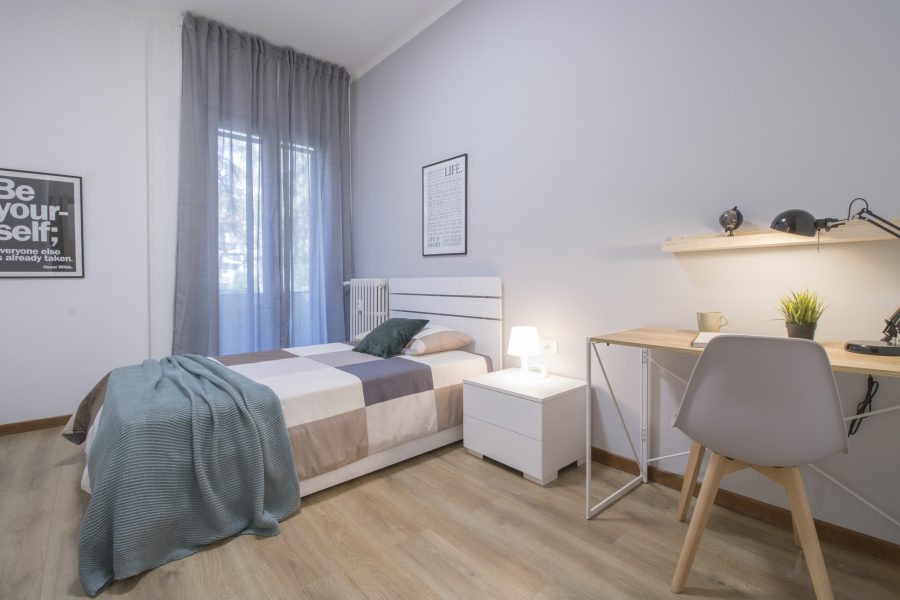 Single room with single bed, slats and mattress structure, a wardrobe with four doors, a bookcase with fabric drawers, a desk and study lamp, a chair, a shelf, a bedside table, an abat-jour, a dresser, two paintings, a mirror