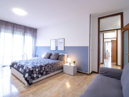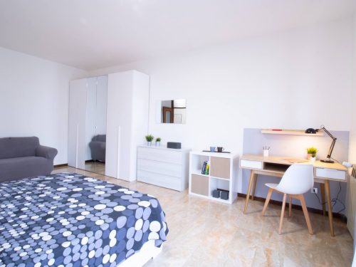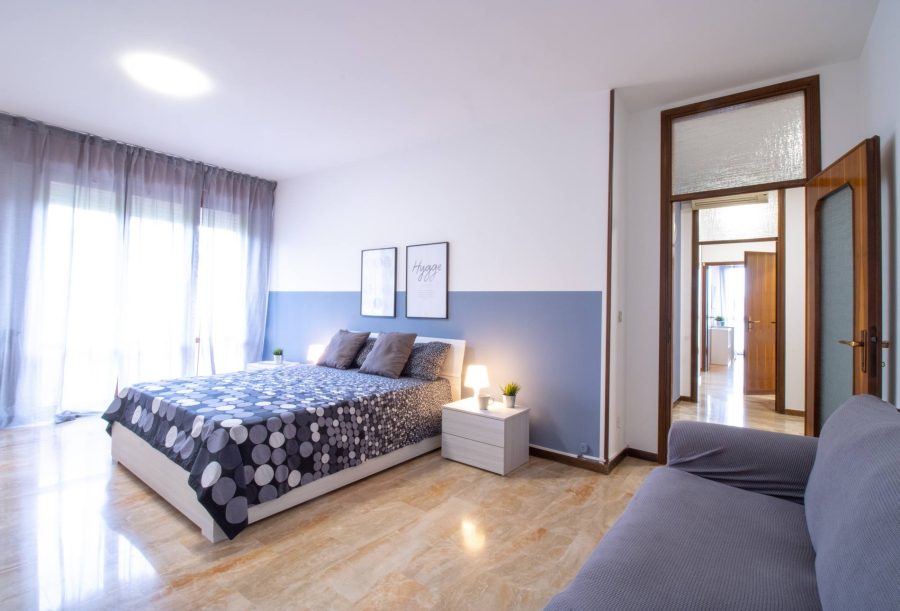 Stanza singola con letto matrimoniale, struttura doghe e materasso, un armadio a sei ante di cui a specchio, una scrivania e lampada da studio, un comò, tre comodini e due abat-jours, una scrivania, una lampada da studio, una libreria con cassetti in tessuto, una mensolina, uno specchio, un divano, due quadri