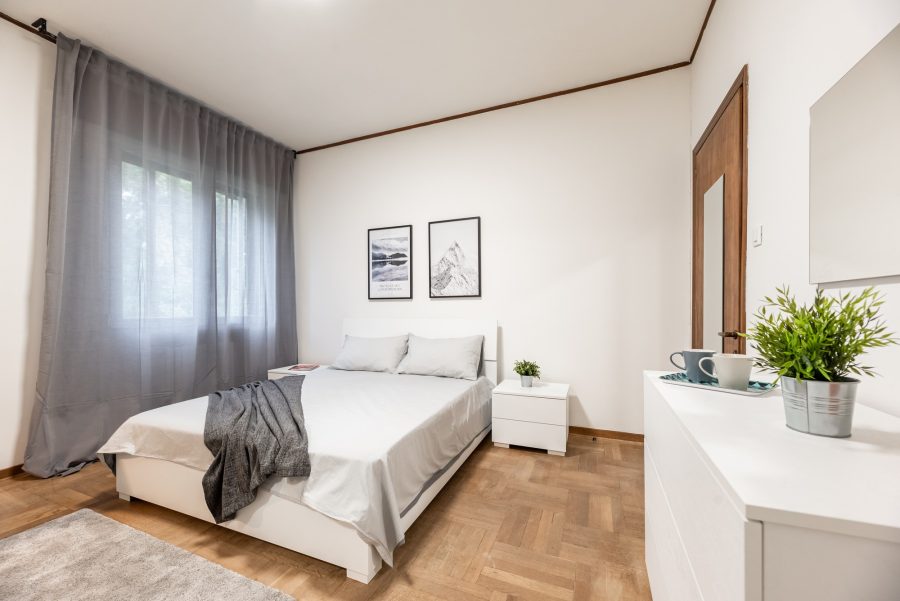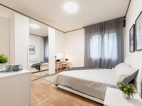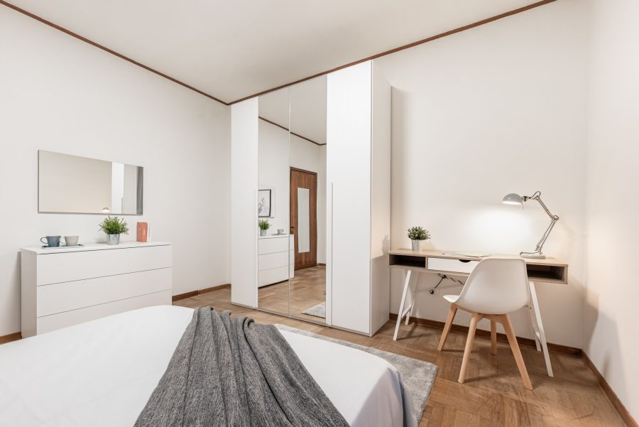Stanza singola con letto matrimoniale, struttura doghe e materasso, un armadio a quattro ante di cui a specchio, una scrivania e lampada da studio,una sedia, un comò, due comodini, uno specchio, due quadri