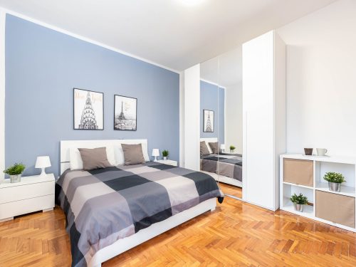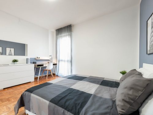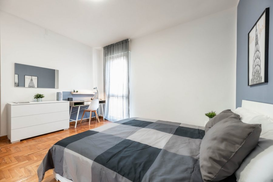 Stanza singola con letto matrimoniale, struttura doghe e materasso, un armadio a quattro ante di cui a specchio, una scrivania e lampada da studio,una sedia, una mensolina, un comò, uno specchio, due comodini e due abat-jours, due quadri