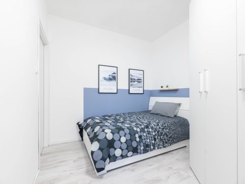 Stanza singola con letto a una piazza e mezza, struttura doghe e materasso, un armadio a tre ante, una scrivania e lampada da studio, una sedia, una mensolina, due quadri.