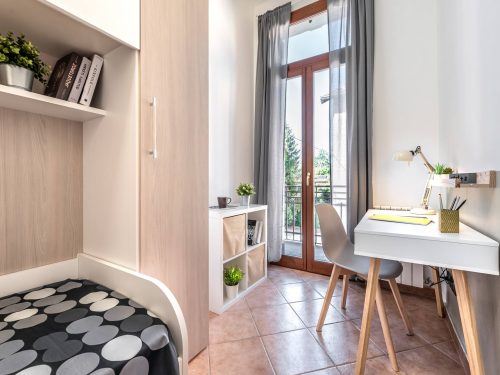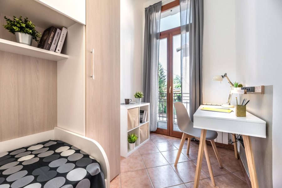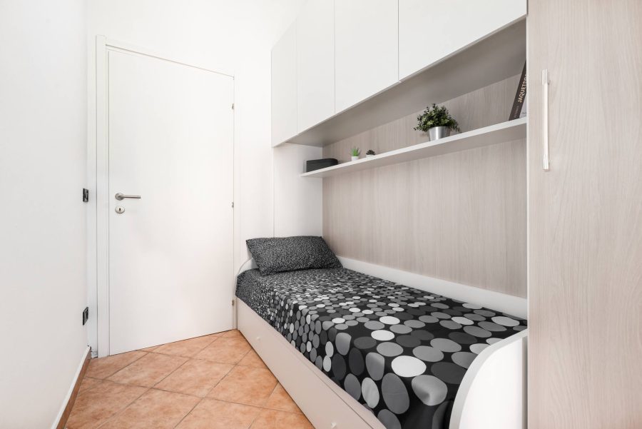Stanza singola con letto singolo, struttura doghe e materasso, un armadio a due anti, una libreria, una scrivania con cassetto e lampada da studio, una sedia, un armadio a ponte