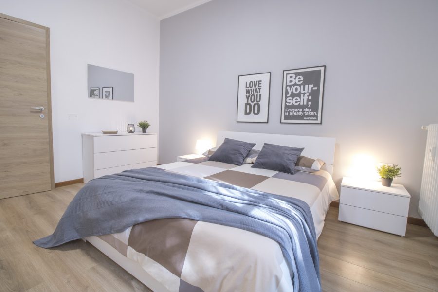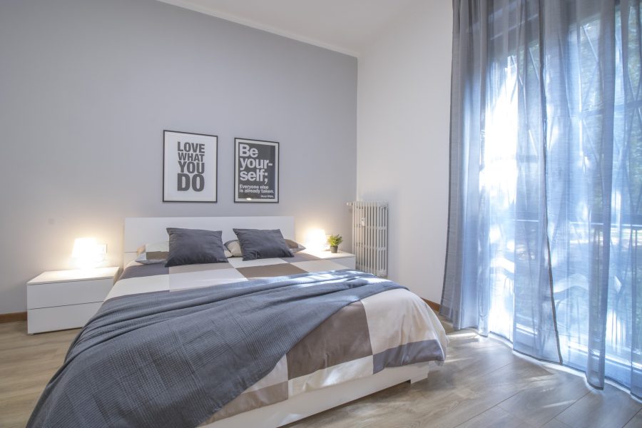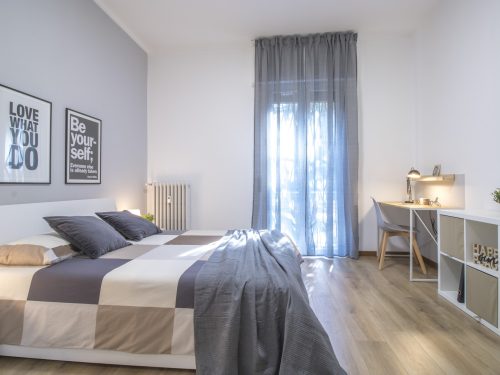 Stanza singola con letto matrimoniale, struttura doghe e materasso, un armadio a quattro ante, una libreria con cassetti in tessuto, una scrivania e lampada da studio, una sedia, una mensolina, due comodini, due abat-jour, un comò, due quadri, uno specchio