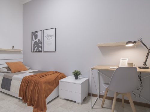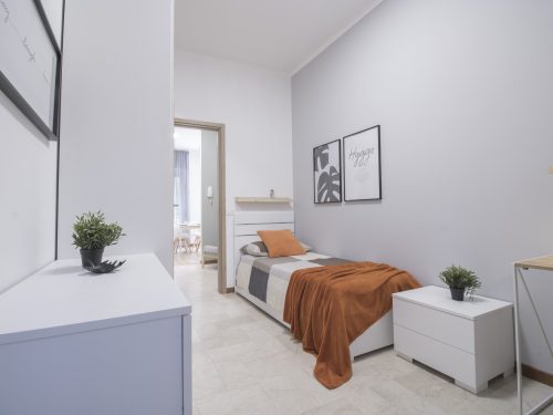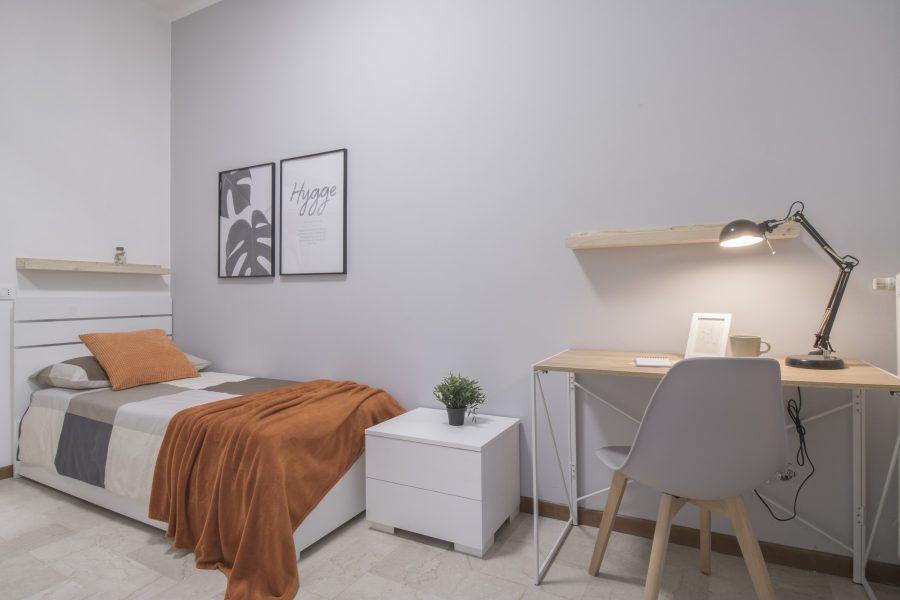 Stanza singola con letto singolo, struttura doghe e materasso, un armadio a quattro ante, un comò, una scrivania e lampada da studio, una sedia, due mensoline, un comodino, due quadri, uno specchio