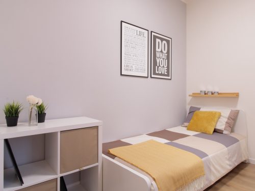 Stanza singola con letto singolo, struttura doghe e materasso, un armadio a tre ante, una libreria con cassetti in tessuto, una scrivania e lampada da studio, una sedia, una mensolina, un comodino,  due quadri