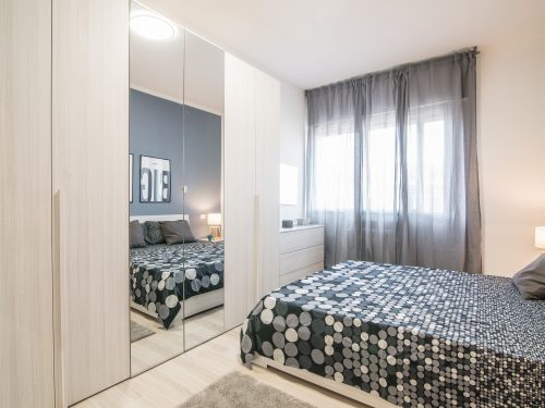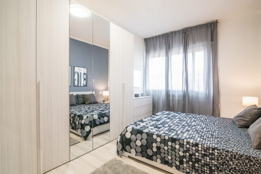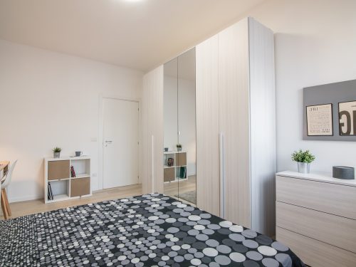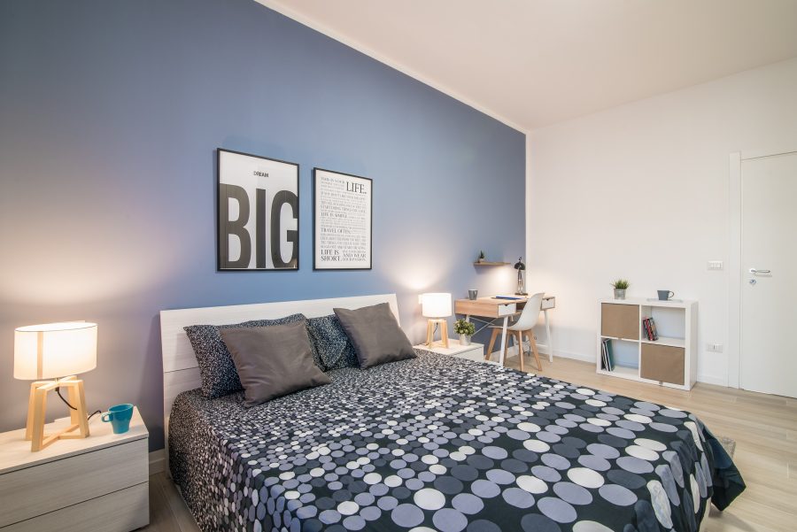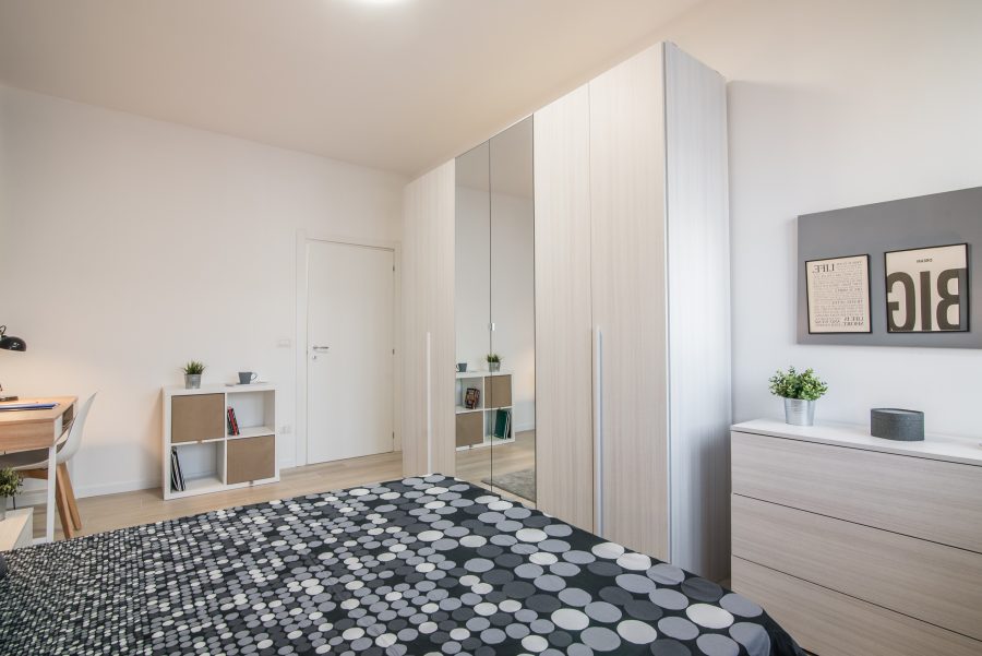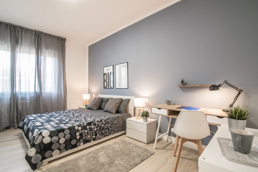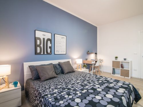 Camera matrimoniale di 15 mq arredata con: scrivania con sedia, armadio a 3 ante, letto matrimoniale, due comodini, rete a doghe in legno e materasso.
